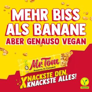 Knackige Erdnüsse, die Energie liefern. Umhüllt von süßem Karamell. Mr.Tom knackt, ohne zu kleckern, bleibt sauber und bringt dich durch den Tag – komme, was wolle.